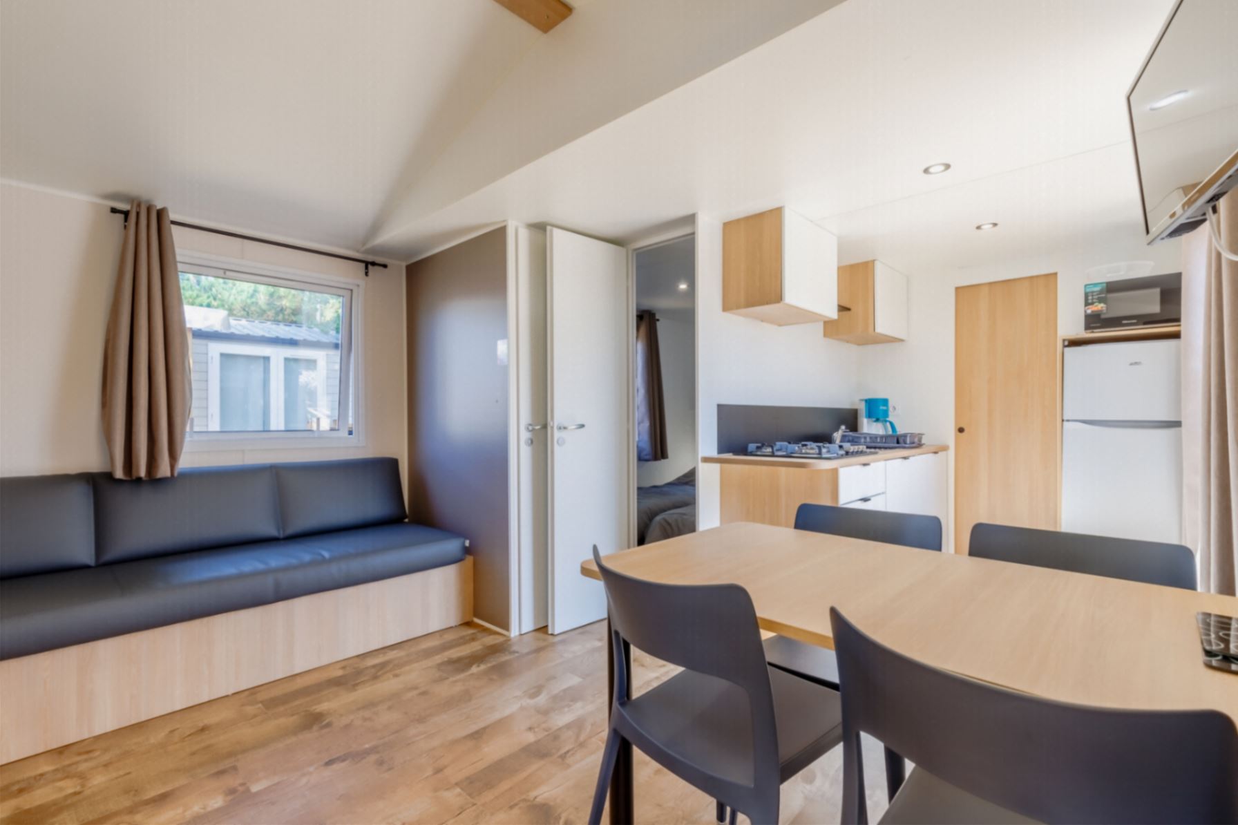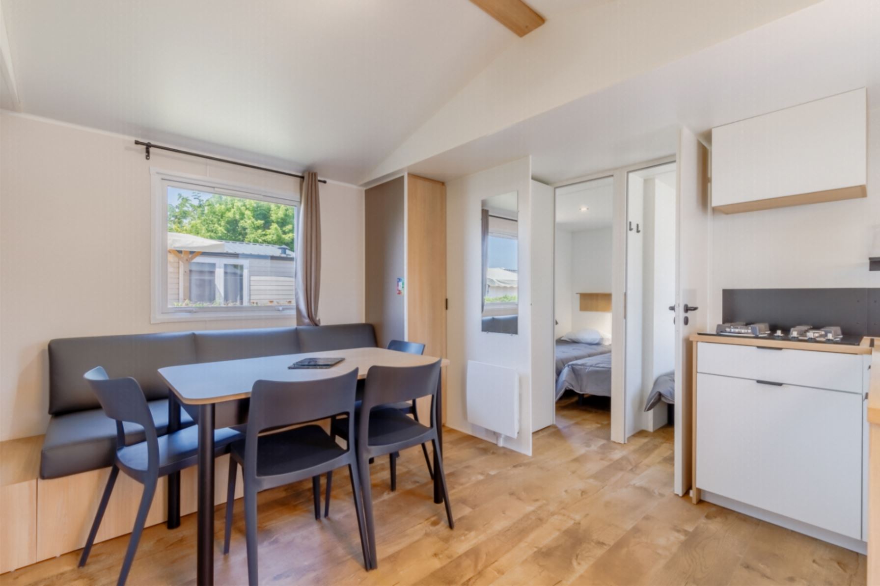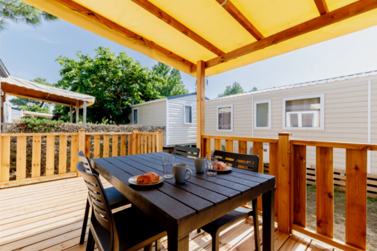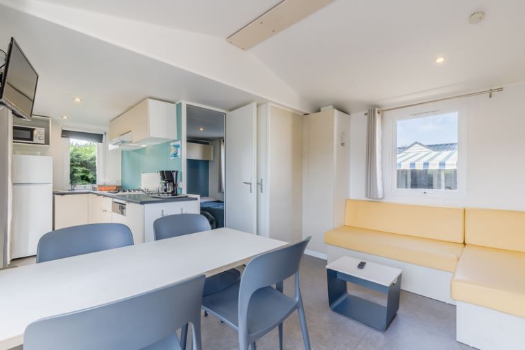 Ein geräumiges Mobilheim (33 m²), das Sie mit seinen drei gemütlichen Zimmern in seinen Komfort einhüllt. Es wurde entworfen, um mit Leichtigkeit Familien oder Gruppen von Freunden aufzunehmen, die sich unvergessliche Erinnerungen schaffen möchten.Mobilheim von 24 bis 34 m² mit allem Komfort, indem Sie aus unseren Mietunterkünften für 2 bis 7 Personen wählen.