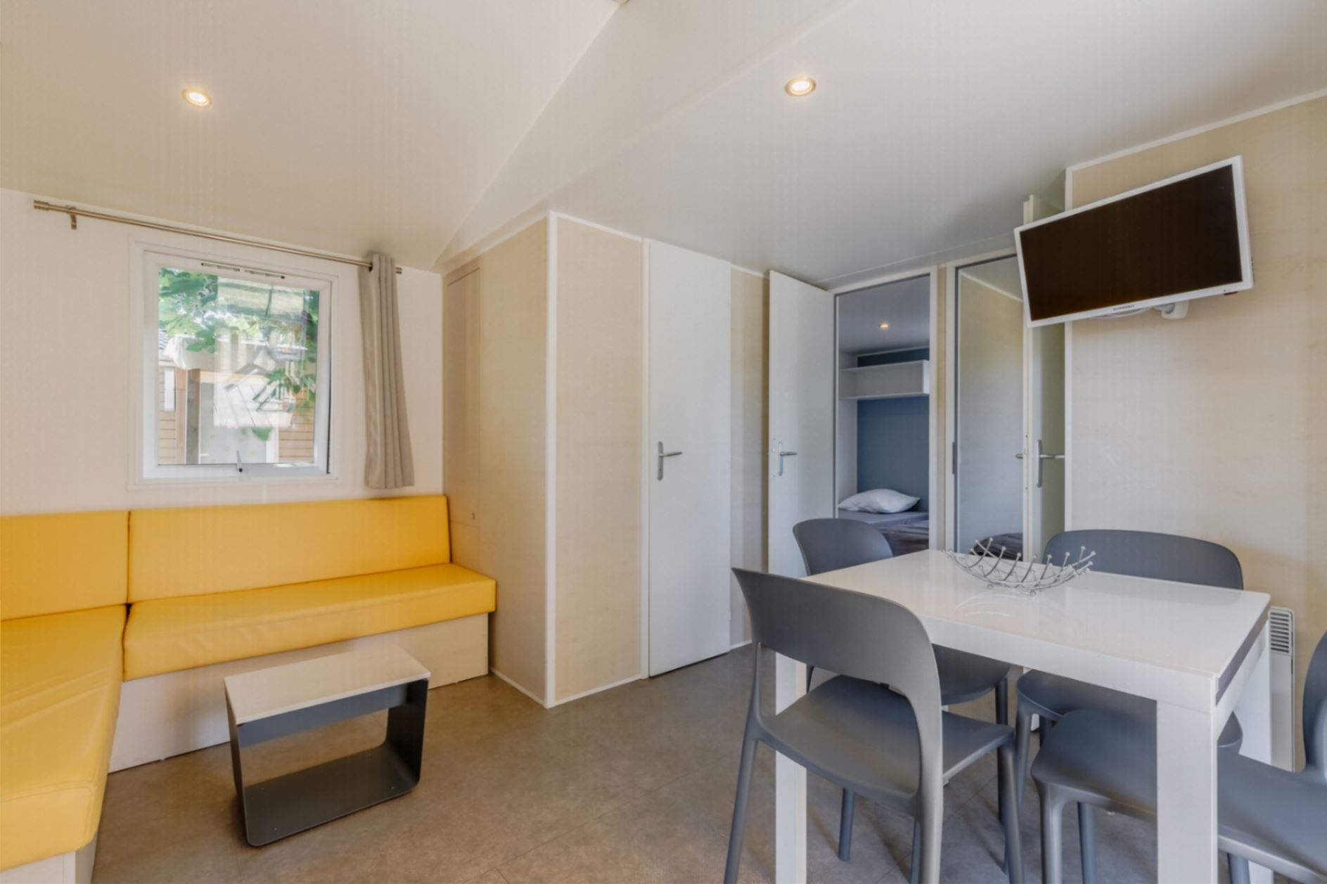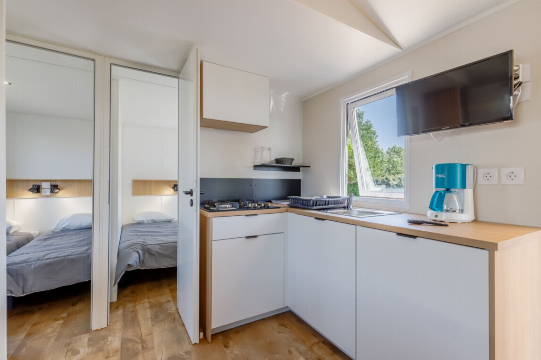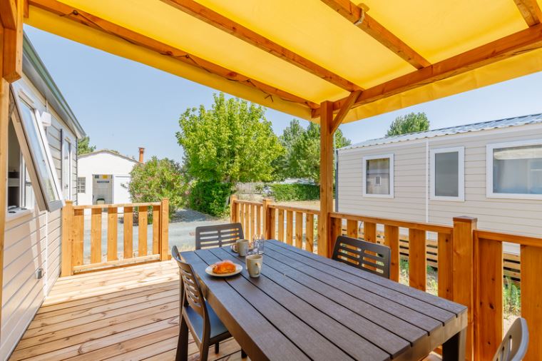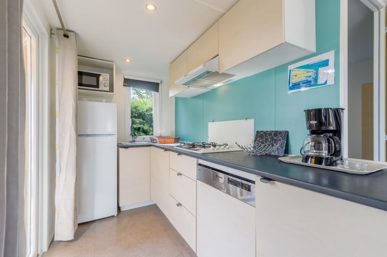 Ein geräumiges Mobilheim (33 m²), das Sie mit seinen drei gemütlichen Zimmern in seinen Komfort einhüllt. Es wurde entworfen, um mit Leichtigkeit Familien oder Gruppen von Freunden aufzunehmen, die sich unvergessliche Erinnerungen schaffen möchten.Mobilheim von 24 bis 34 m² mit allem Komfort, indem Sie aus unseren Mietunterkünften für 2 bis 7 Personen wählen.